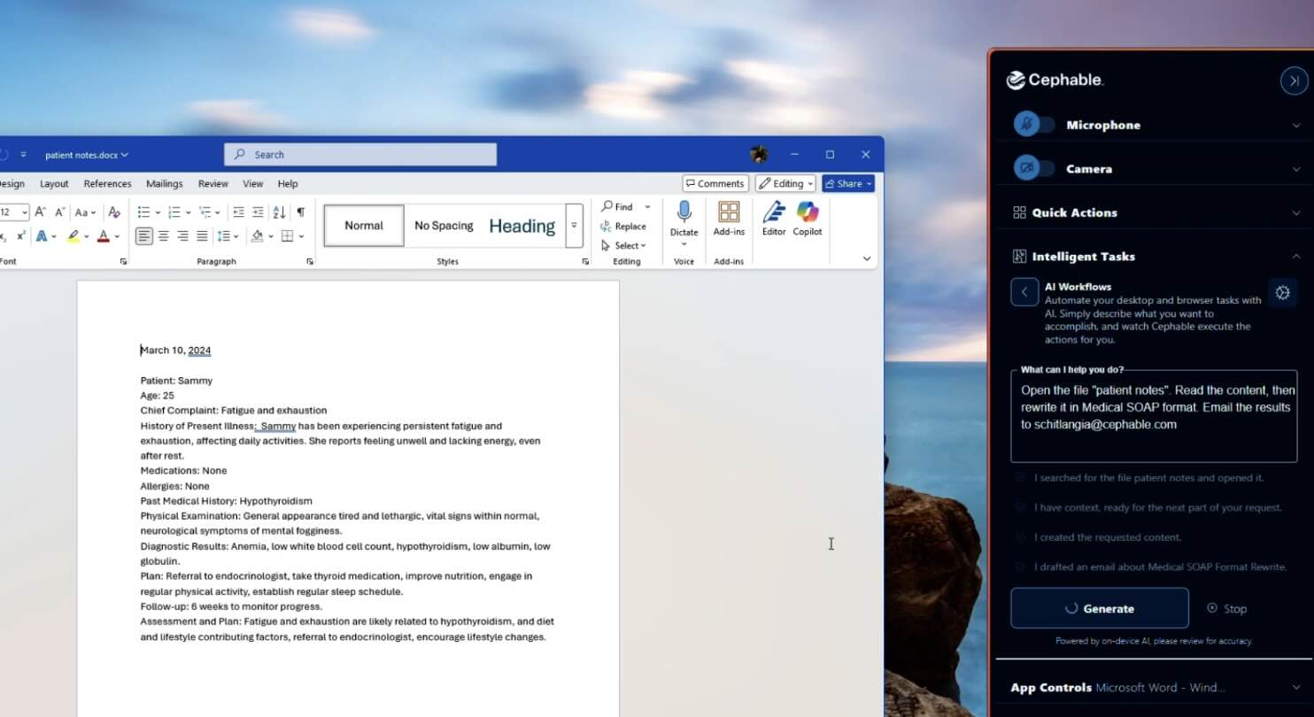 Most AI today acts like a consultant, it gives you advice but leaves the execution to you. You remain the “middleman,” manually moving data between a chatbot and your actual apps. With Cephable Workflows, you describe what you want to accomplish, and your on‑device AI agent handles the rest. It plans the steps, executes them across your desktop apps, browser, email, and documents, and shows you exactly what it’s doing along the way.